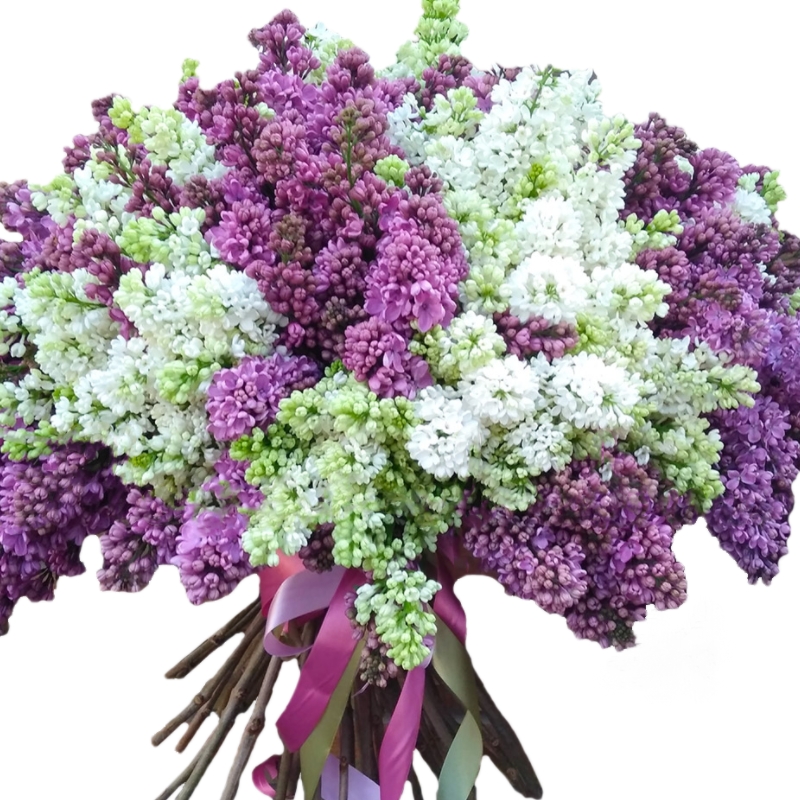 Букет состоит из 45 веток сирени, прозрачная упаковка, атласная лента.