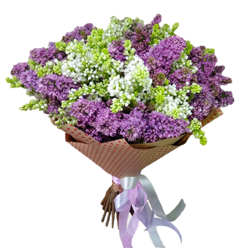 Букет состоит из 19 веток сирени, крафт, атласная лента.