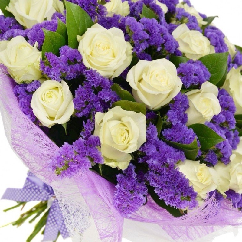 Букет состоит из 25 белых роз, 11 статица, зелень, красивая упаковка.
