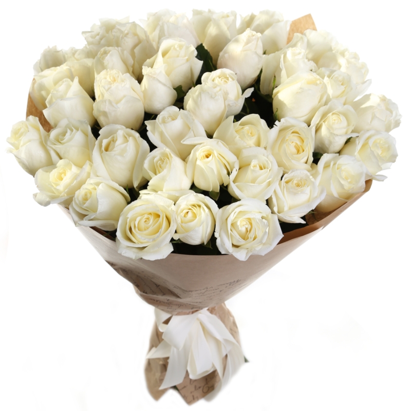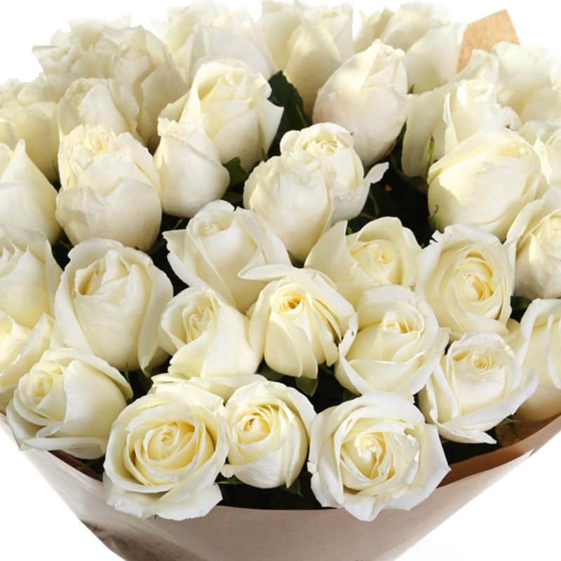 Букет состоит из 31 белая роза, крафт, атласная лента.