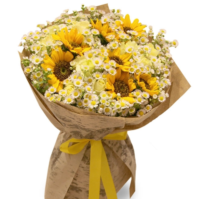 Букет состоит из 7 подсолнухов, 10 роз, 10 веток танацетума, зелень, крафт, атласная лента.