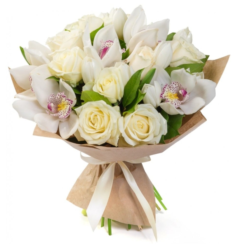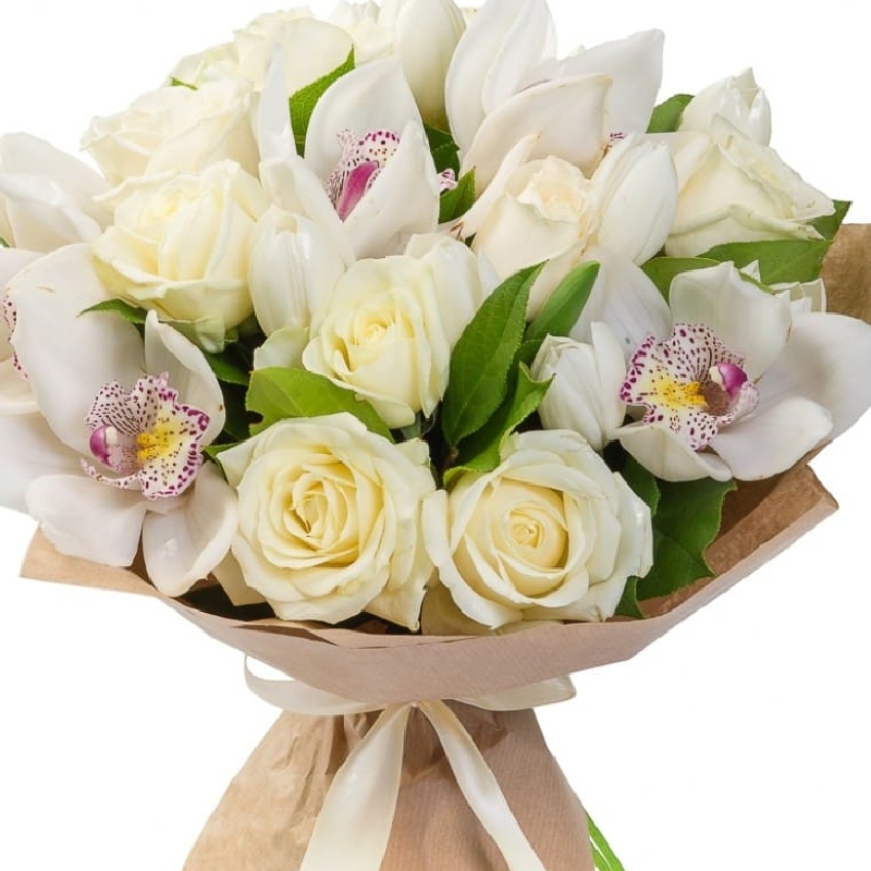 Букет состоит из 10 роз, 10 тюльпанов, 5 орхидей, крафт, атласная лента.