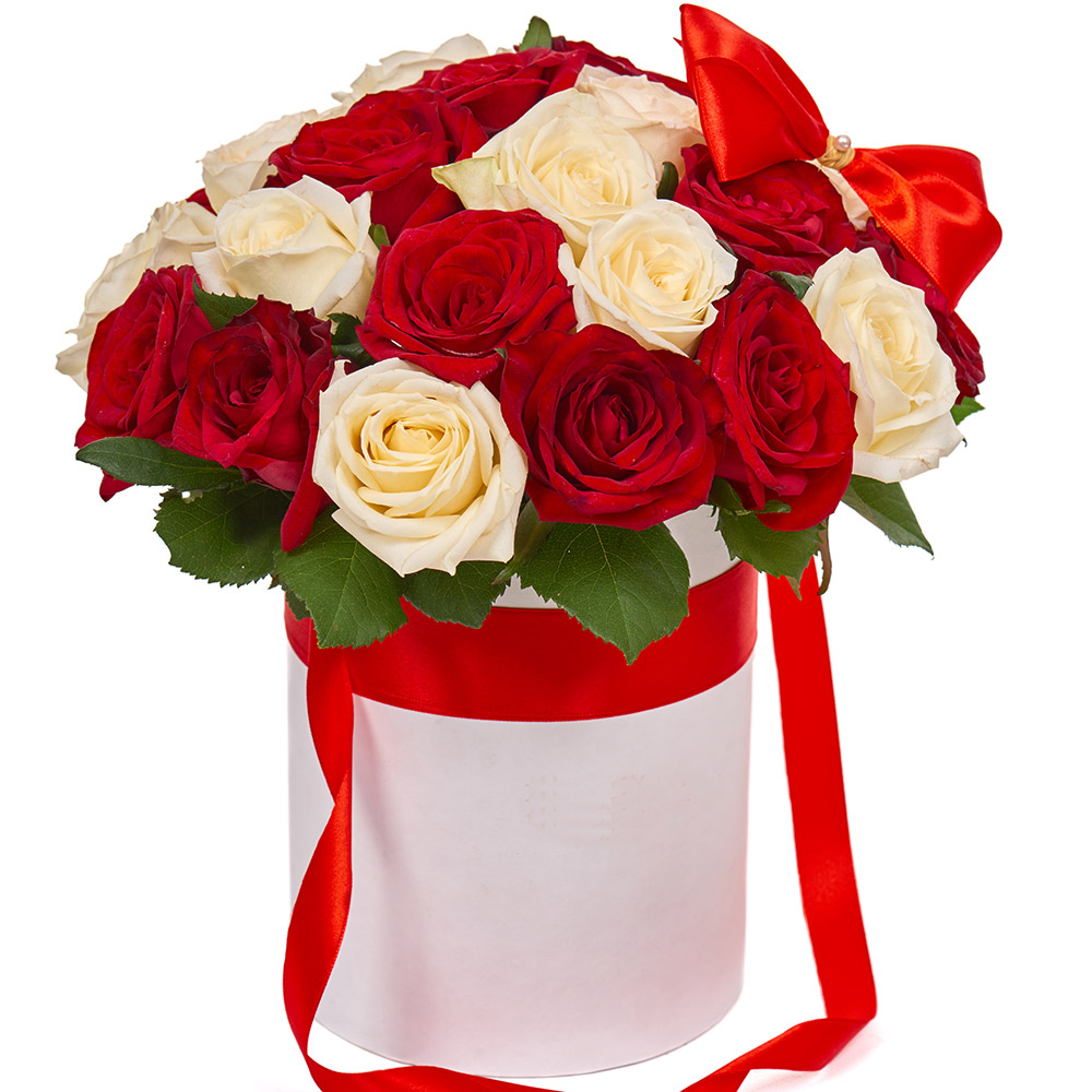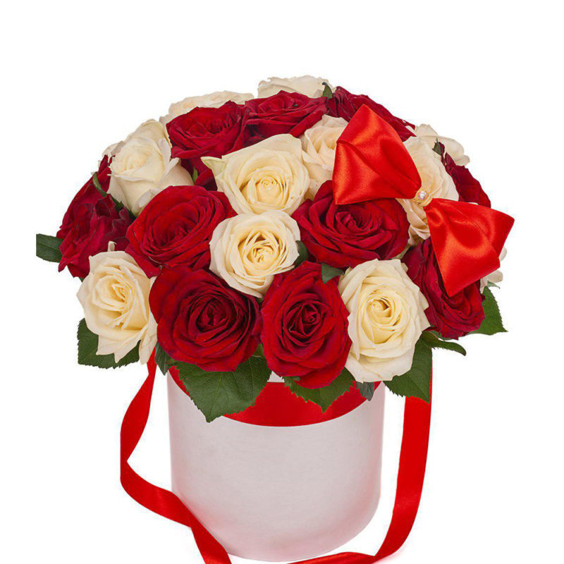 13 красных роз, 12 белых роз, белая коробка, красная лента, оазис, зелень.