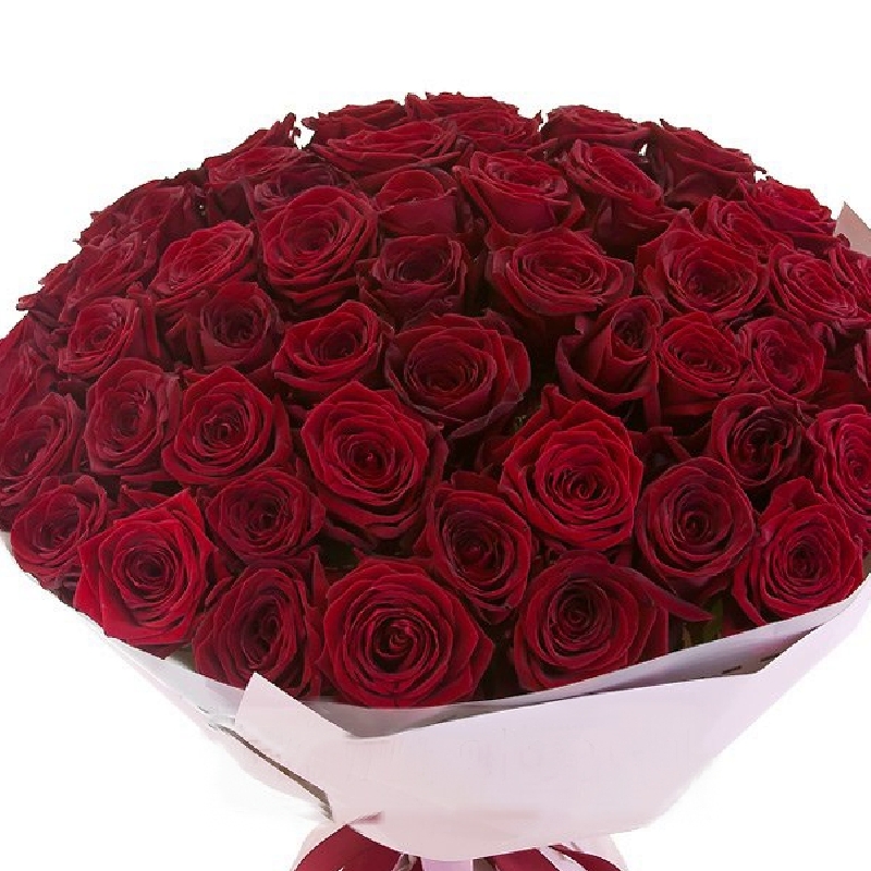 Букет состоит из 51 бордовая роза, розовый крафт, атласная лента.