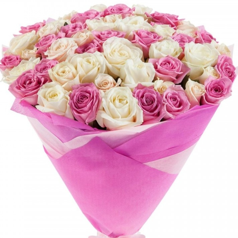 Букет состоит из 23 розовые розы, 22 белые розы, красивая упаковка, атласная лента.