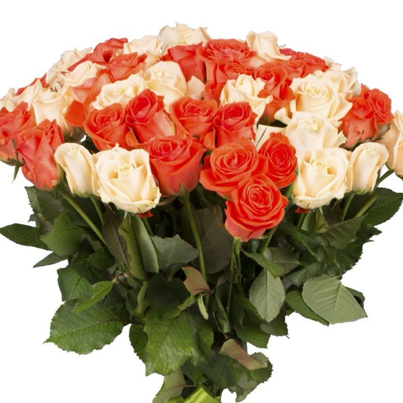 Букет состоит из 23 оранжевые розы, 22 кремовые розы, прозрачная упаковка, атласная лента.