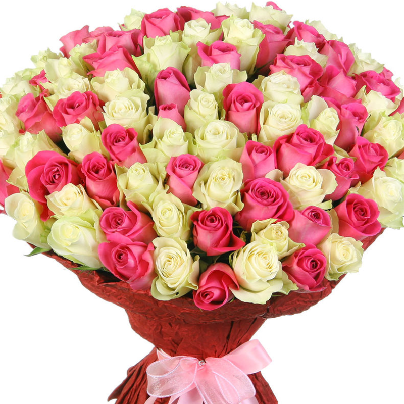 Букет состоит из 50 белых роз, 51 розовая роза, розовая упаковка, розовая лента.