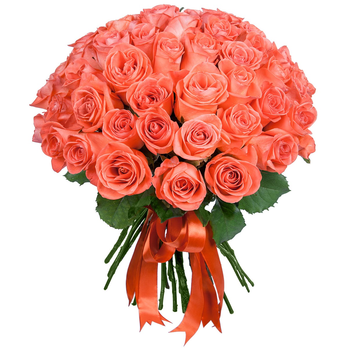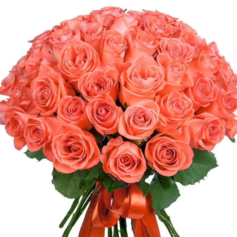 Букет состоит из 51 коралловая роза, прозрачная упаковка, атласная лента.