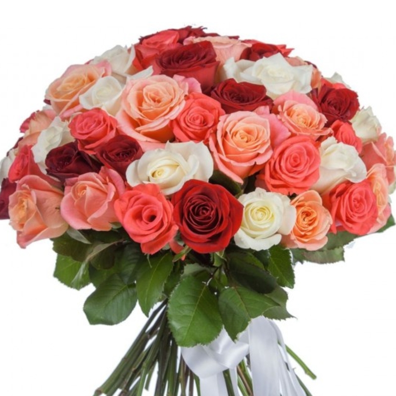 Букет состоит из MIX из 55 роз, прозрачная упаковка, атласная лента.