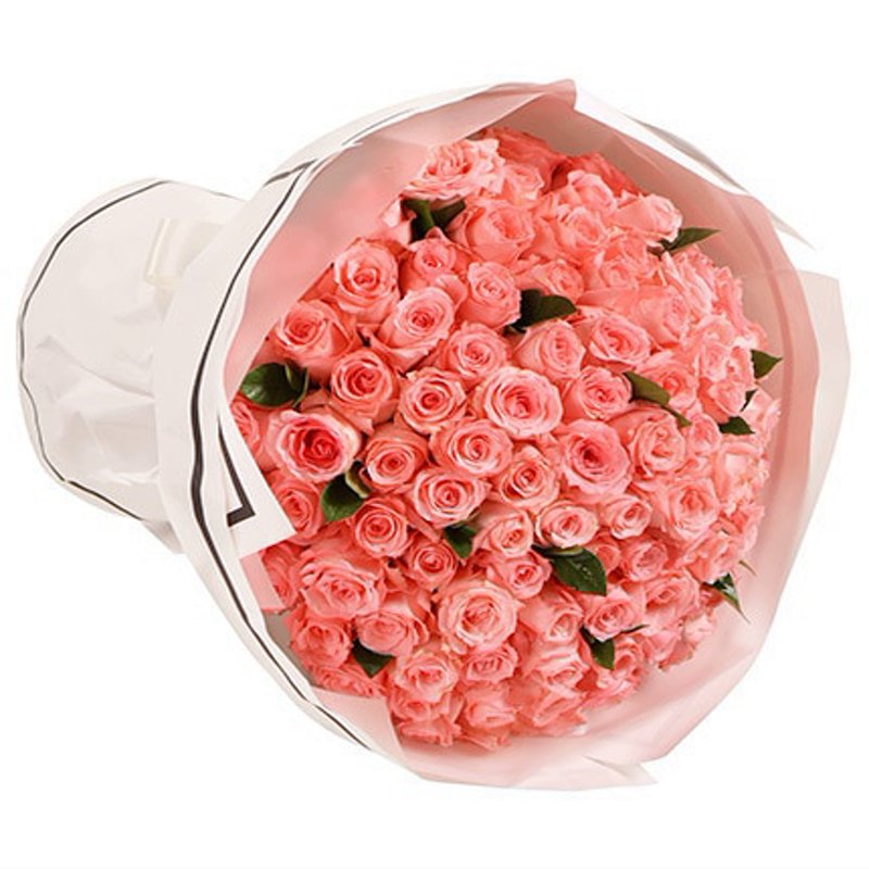Букет состоит из 51 коралловая роза, прозрачная упаковка, атласная лента.