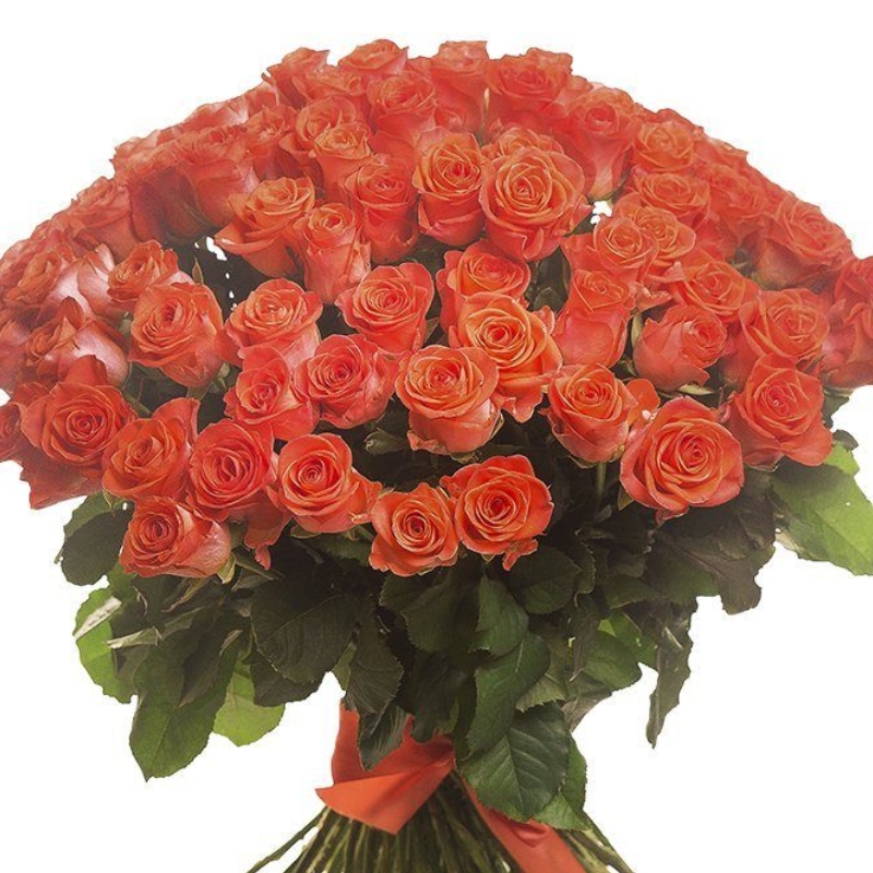 Букет состоит из 101 коралловая роза, прозрачная упаковка, атласная лента.
