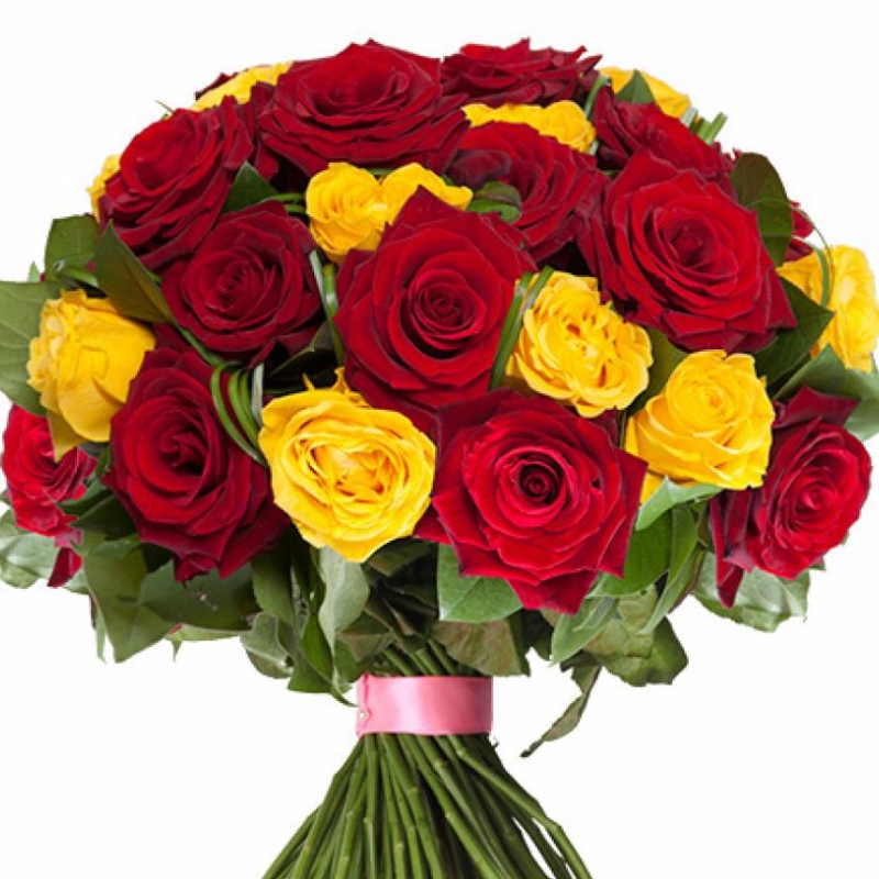 Букет состоит из 16 красных роз, 15 желтых роз, зелень, прозрачная упаковка, атласная лента.