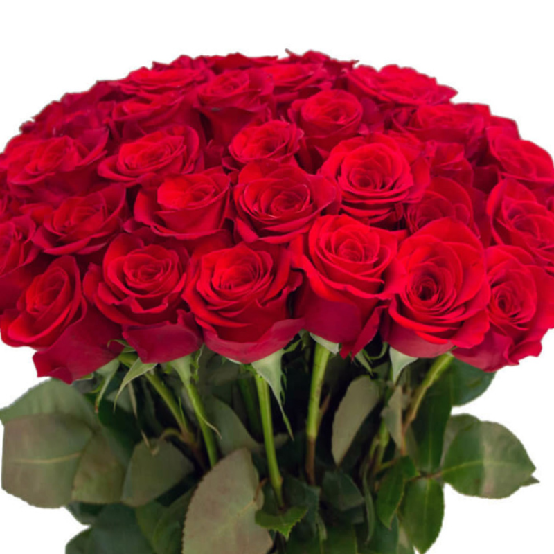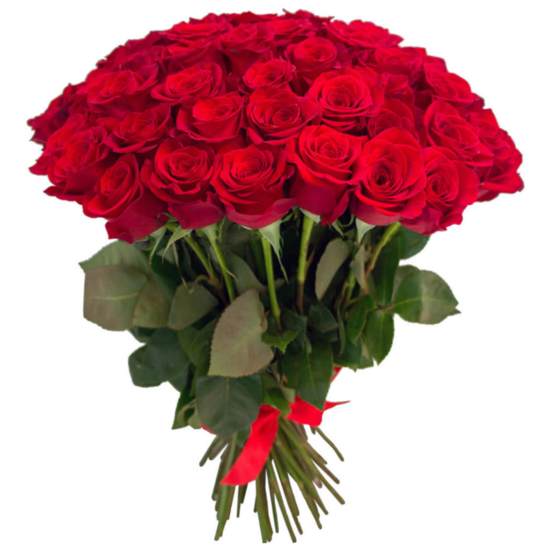 Букет состоит из 45 красных роз, прозрачная упаковка, атласная лента.