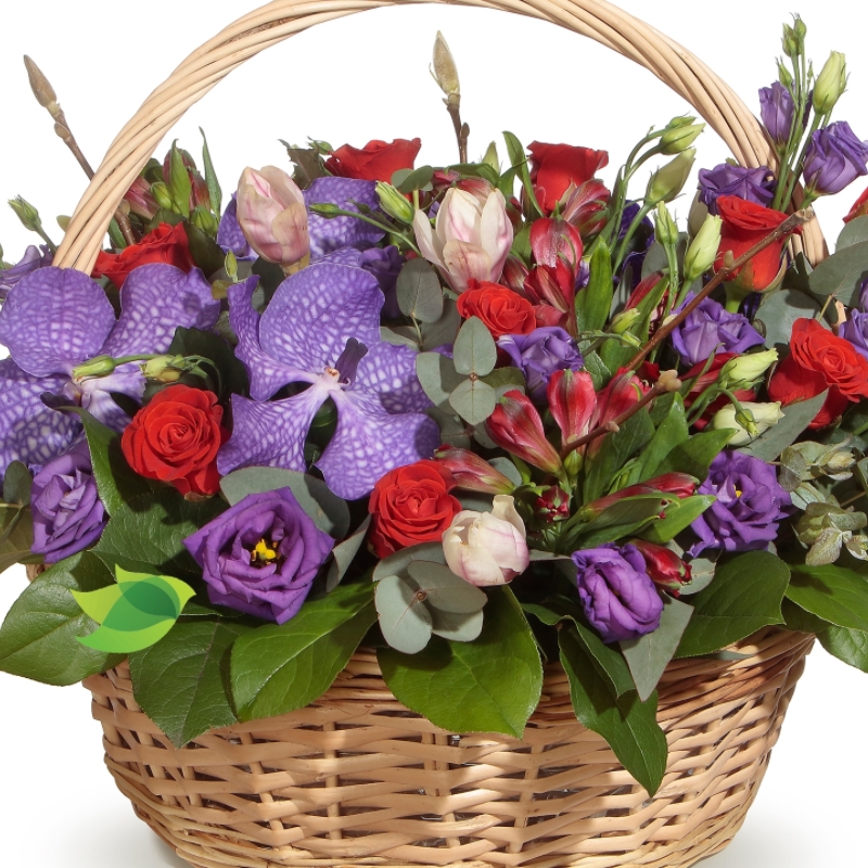 Букет состоит из 11 роз, 5 орхидей, 5 веток эустомы, 4 альстромерии, зелень, корзина, оазис.