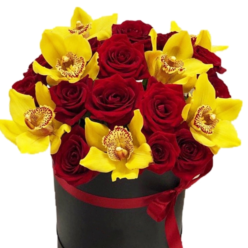 Букет из роз и орхидей в коробке "Гусар"