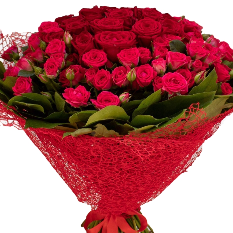 Букет состоит из 19 красных роз, 20 кустовых роз, зелень, красивая упаковка, атласная лента.
