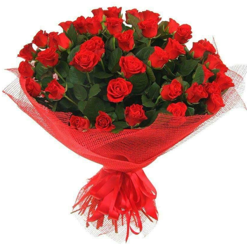 Букет состоит из 35 красных роз, красная упаковка.