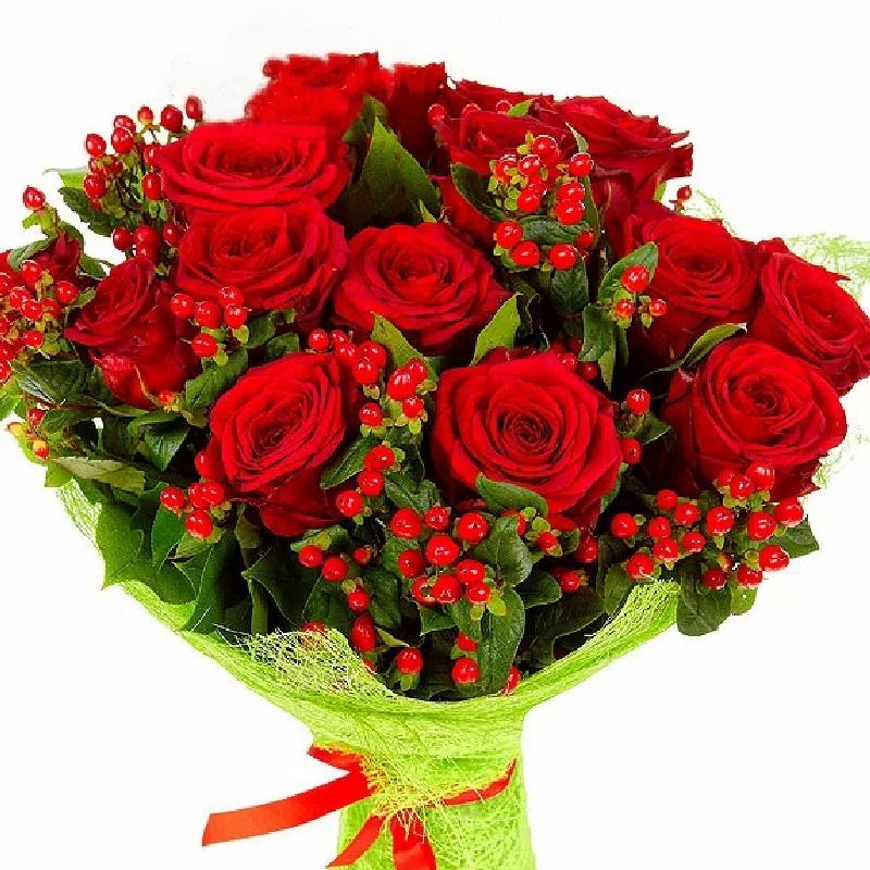 Букет состоит из 15 красных роз, 11 гиперикум, сизаль, атласная лента.