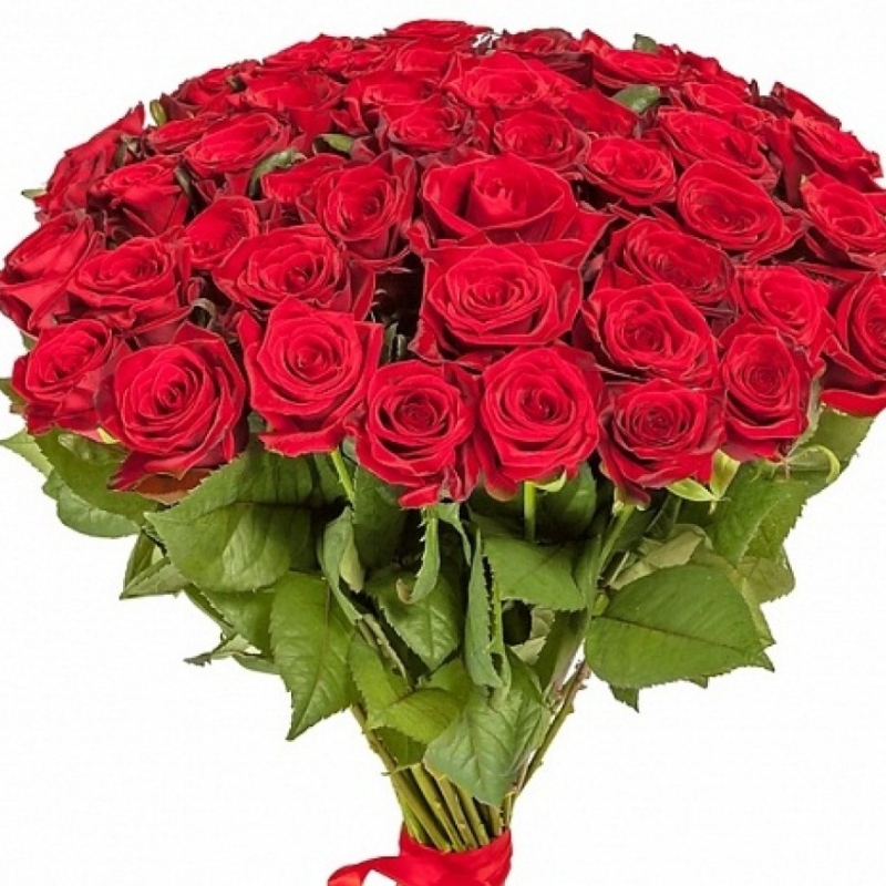 Букет состоит из 55 красных роз, прозрачная упаковка, атласная лента.