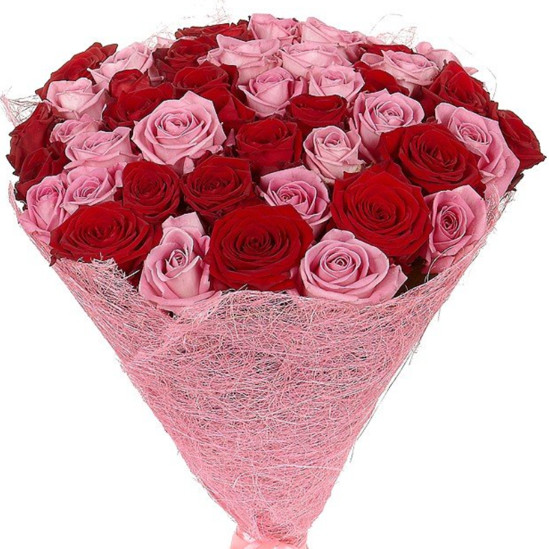 Букет состоит из 31 розовая роза, 20 красных роз, розовая упаковка, розовая или красная лента.