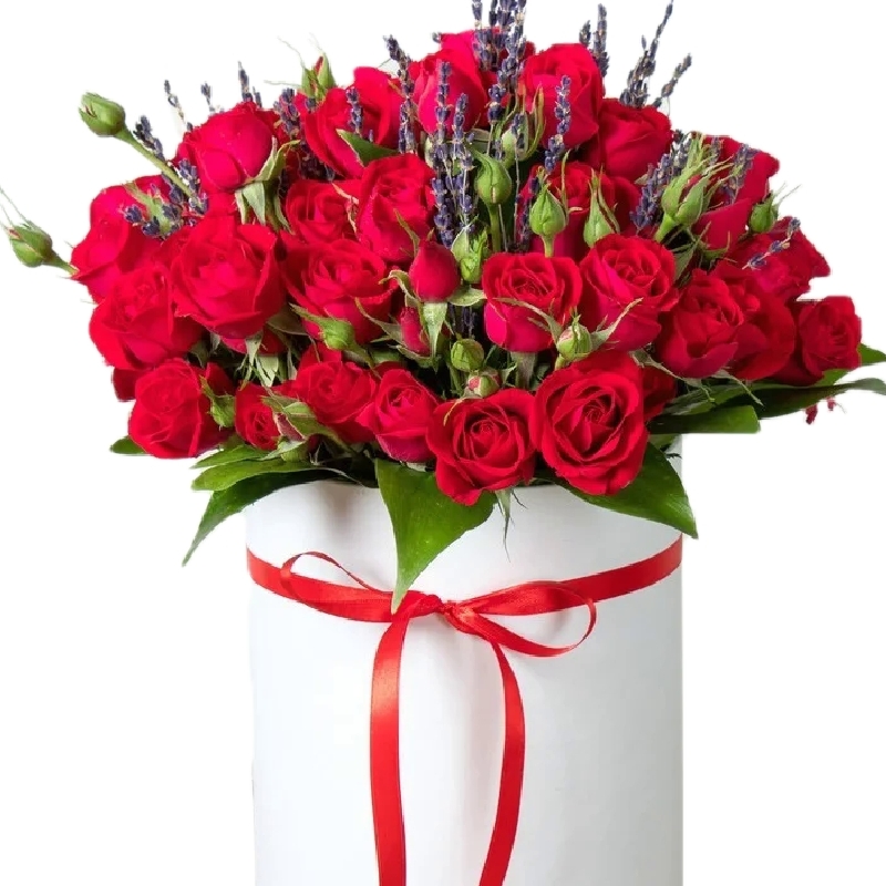 Букет состоит из 19 красных кустовых роз, лаванда, коробка, оазис, атласная лента.
