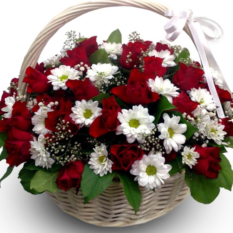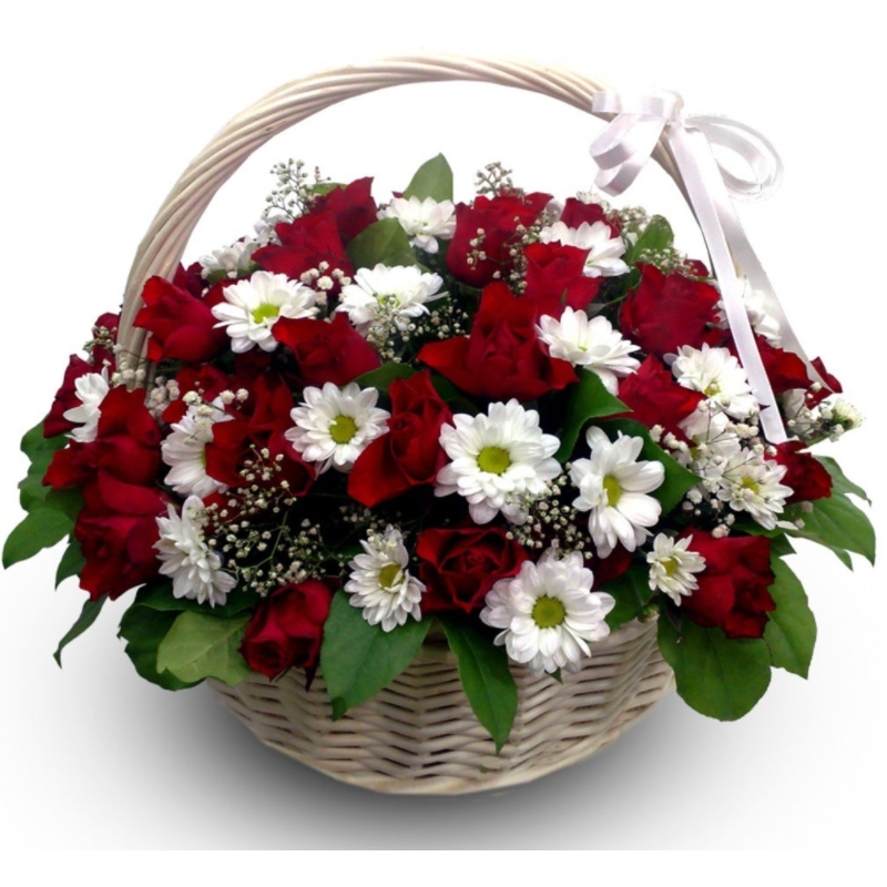 35 красных роз, 8 веток хризантемы, 5 гипсофила, корзина, атласная лента.