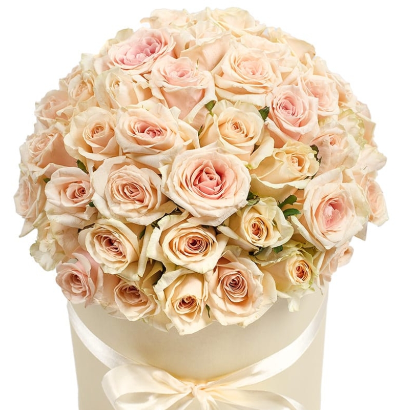 Букет состоит из 51 кремовая роза, коробка, атласная лента.