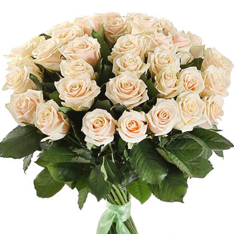 Букет состоит из 35 кремовых роз, прозрачная упаковка, бежевая лента.