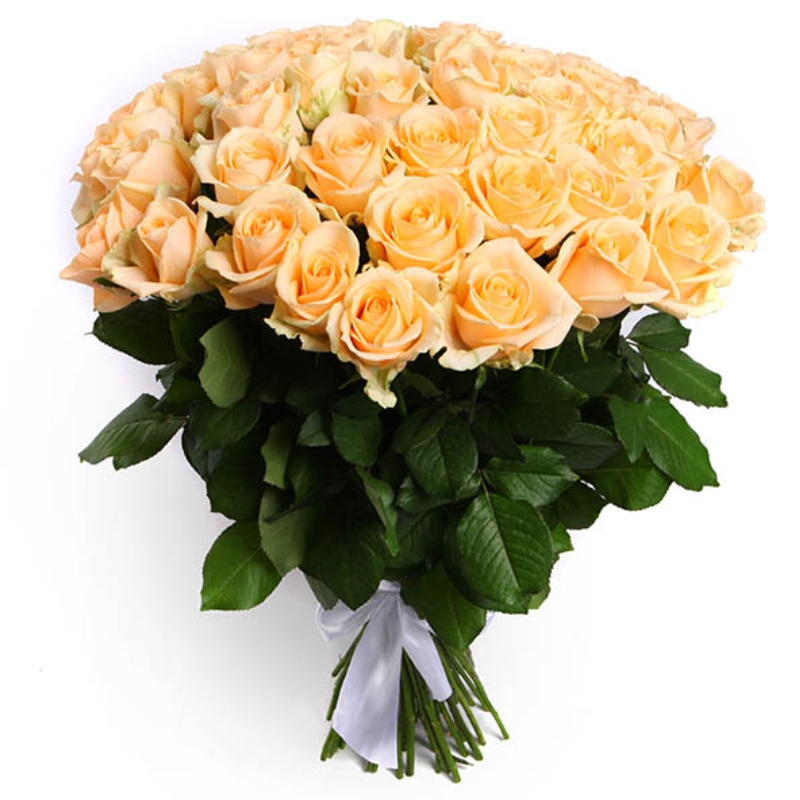 Букет состоит из 55 кремовых роз, прозрачная упаковка, атласная лента.