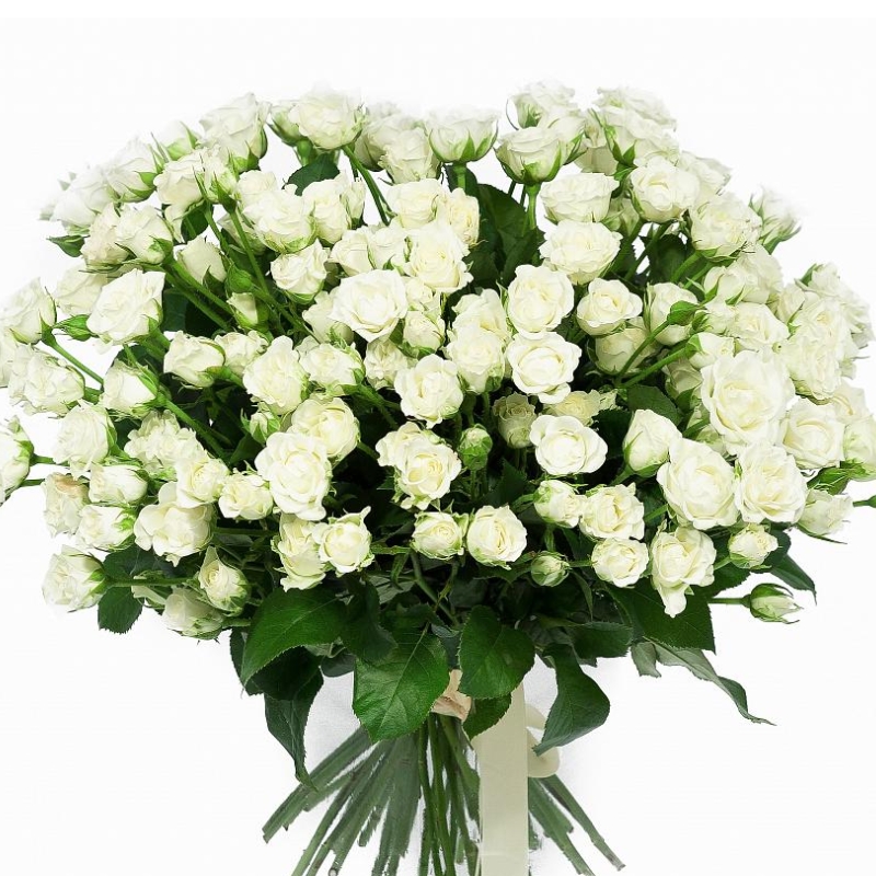 Букет состоит из 35 белых кустовых роз, прозрачная упаковка, атласная лента.