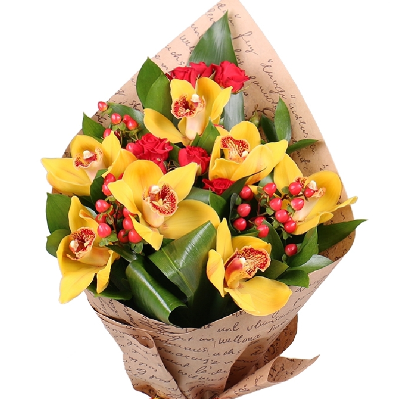 Букет состоит из 7 желтых орхидей, 2 ветки кустовой розы, 3 гиперикум, аспидистра, крафт, атласная лента.