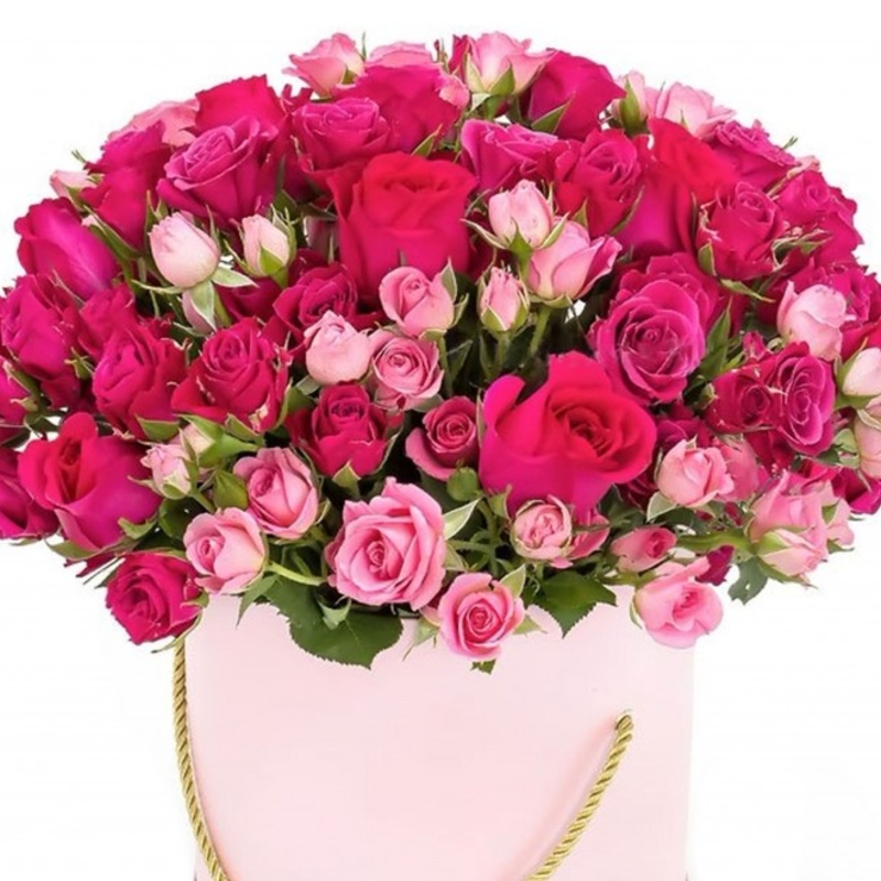 Букет состоит из 7 малиновых роз, 15 веток малиновой кустовой розы, 9 розовой кустовой розы, коробка, оазис.