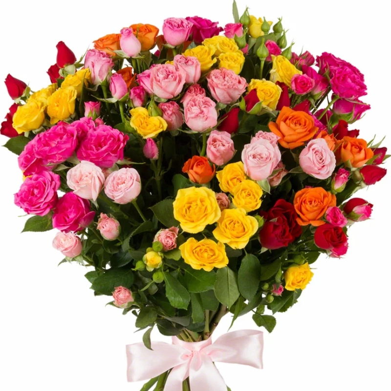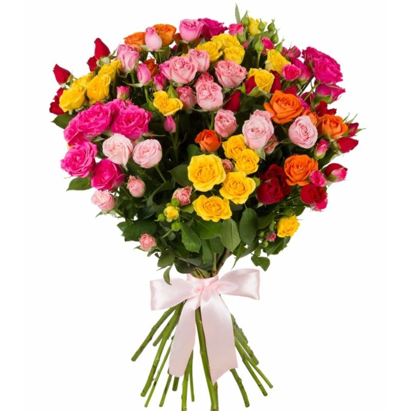 Букет состоит из MIX из 21 ветки кустовой розы, прозрачная упаковка, атласная лента.