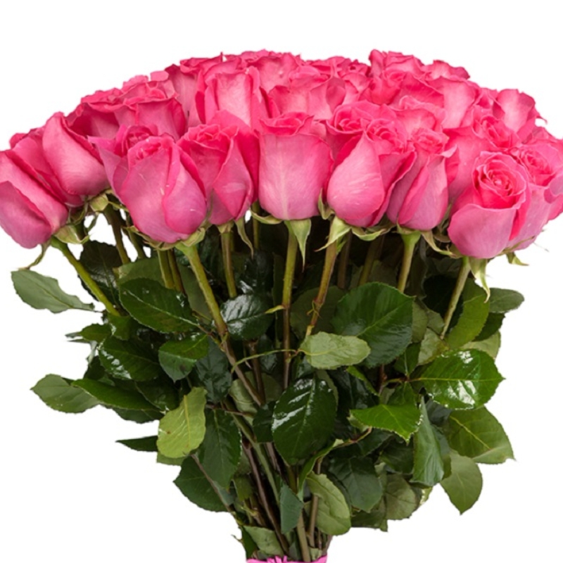 Букет состоит из 55 малиновых роз, прозрачная упаковка, атласная лента.