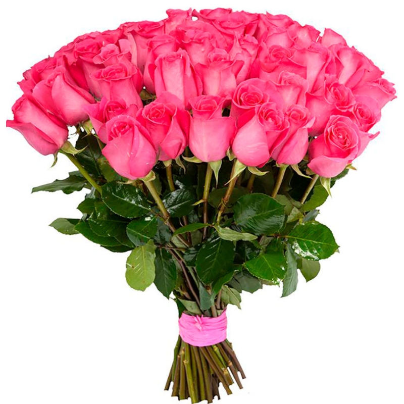 Букет состоит из 51 малиновая роза, прозрачная упаковка, атласная лента.