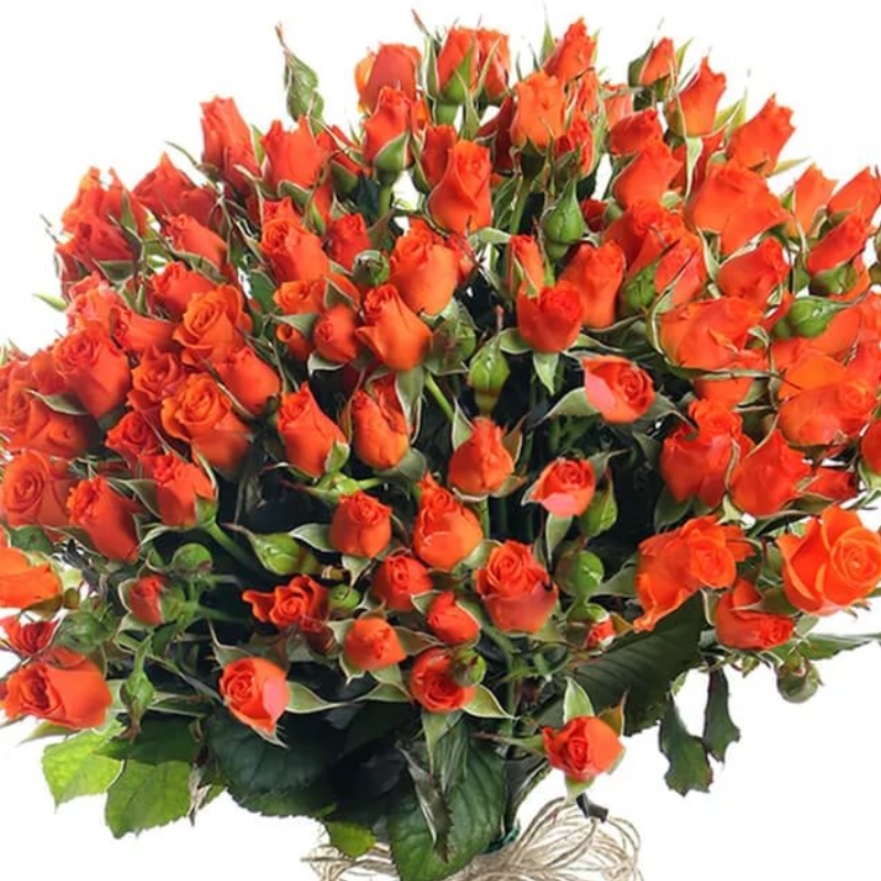 Букет состоит из 31 кустовая оранжевая роза, прозрачная упаковка, атласная лента.