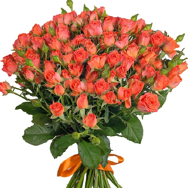 Букет состоит из 25 оранжевых кустовых роз, прозрачная упаковка, атласная лента.