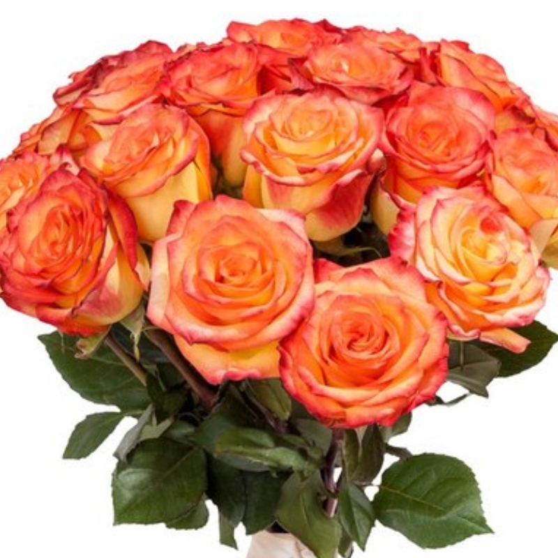 Букет состоит из 25 оранжевых роз, прозрачная упаковка, атласная лента.