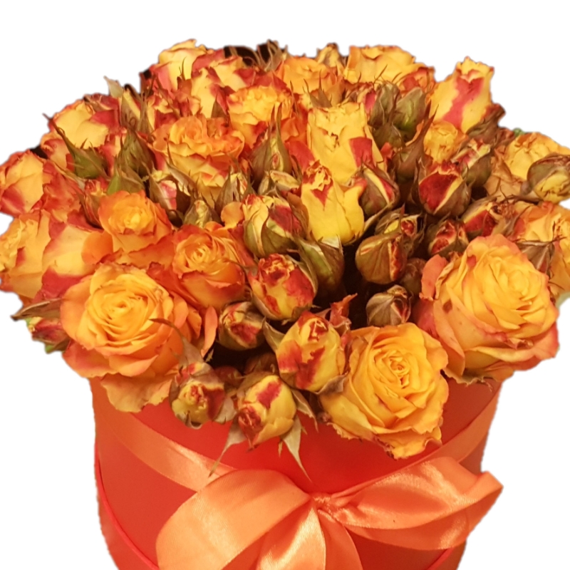 Букет состоит из 15 оранжевых роз, 7 веток кустовых роз, шляпная коробка, атласная лента.