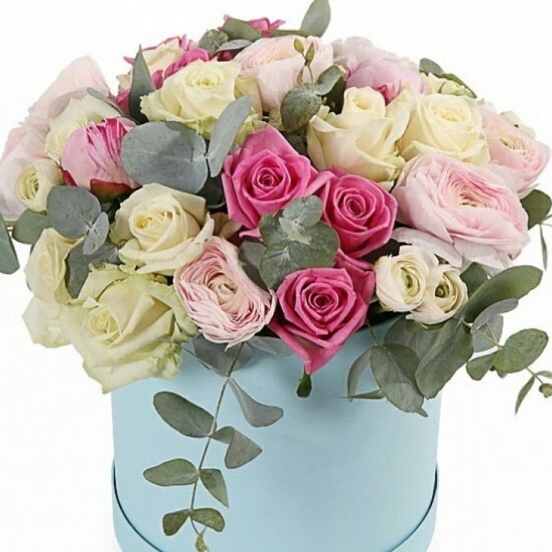 Букет состоит из 17 роз, 9 ранункулюсов, 3 пионовидные розы, эвкалипт, коробка, оазис.