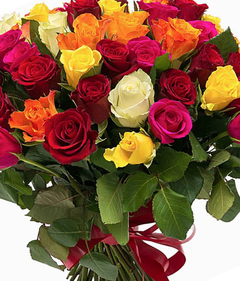 Букет состоит из MIX из 55 роз, прозрачная упаковка, атласная лента.