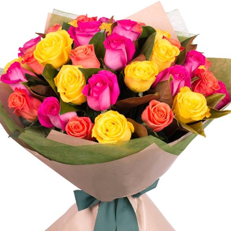 Букет состоит из MIX из 35 роз, зелень, крафт, атласная лента.