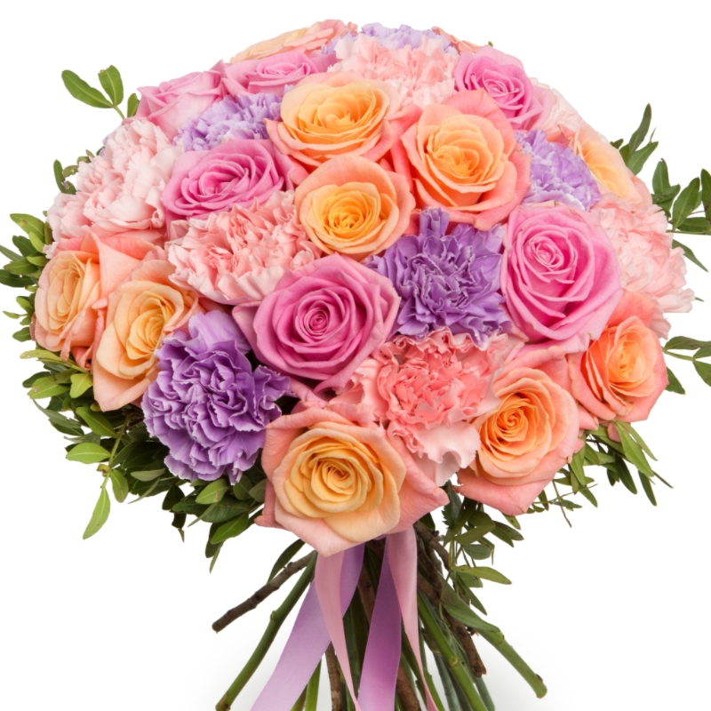 Букет состоит из 21 роза, 18 гвоздик, зелень, прозрачная упаковка, атласная лента.