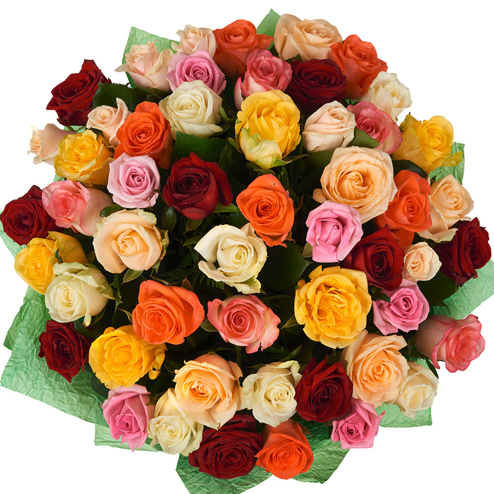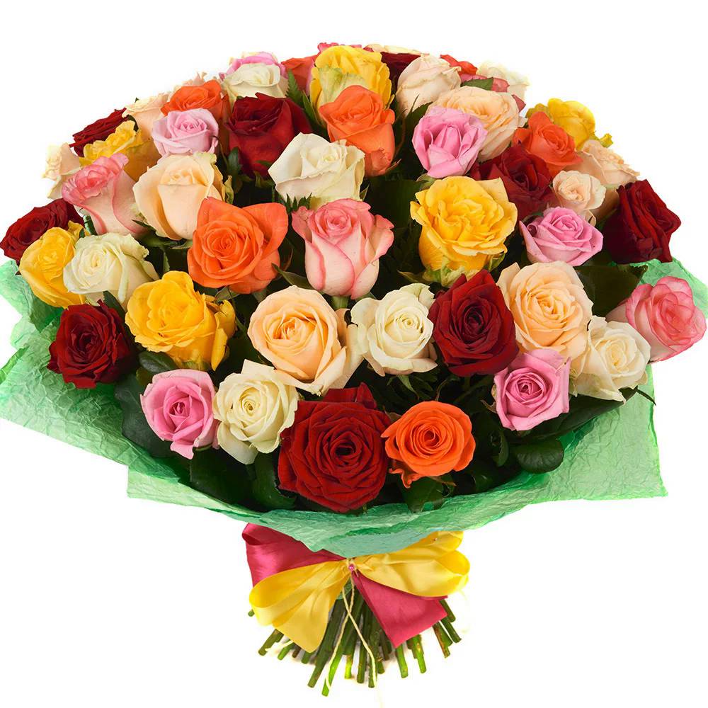 Букет состоит из MIX из 55 роз разных цветов, красивая упаковка, атласная лента.