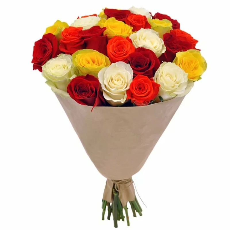 Букет состоит из MIX из 21 розы, крафт, атласная лента.