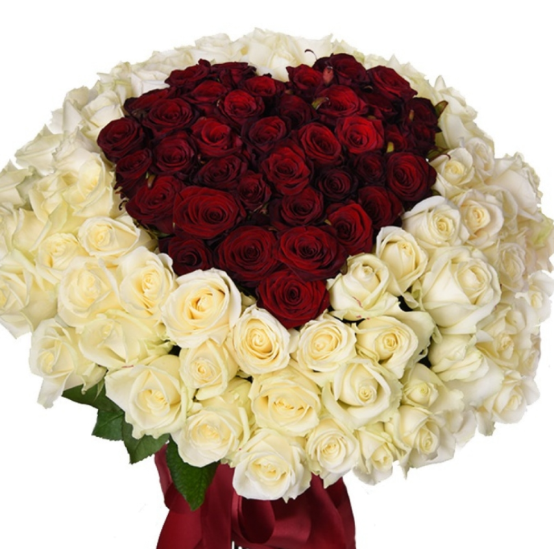Букет из 101 белой и красной розы в виде сердца