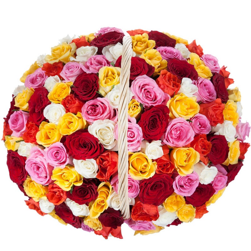 Букет состоит из MIX из 101 розовой / красной / белой / желтой и оранжевой розы, корзина.