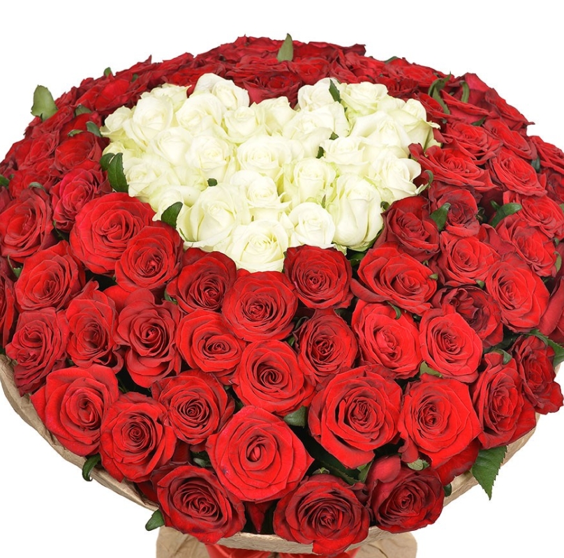 Букет состоит из 101 красная и белая роза, крафт, атласная лента.