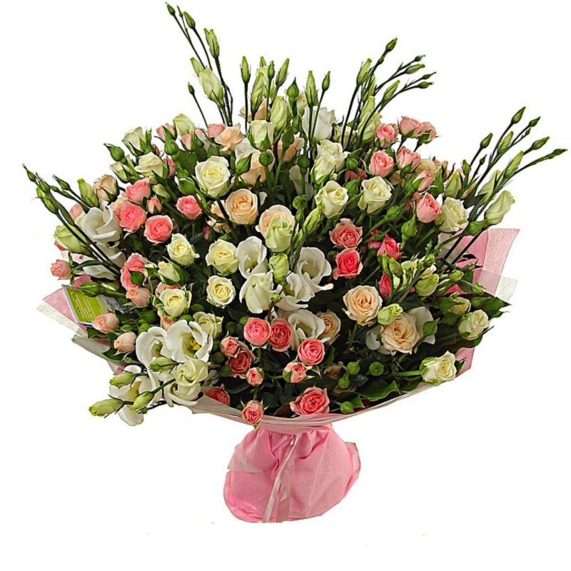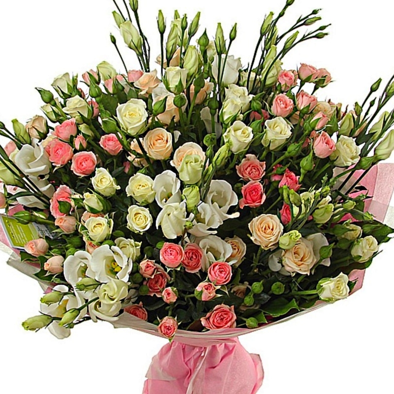 Букет состоит из 20 белых и розовых кустовых роз, 15 веток эустом, красивая упаковка, атласная лента.