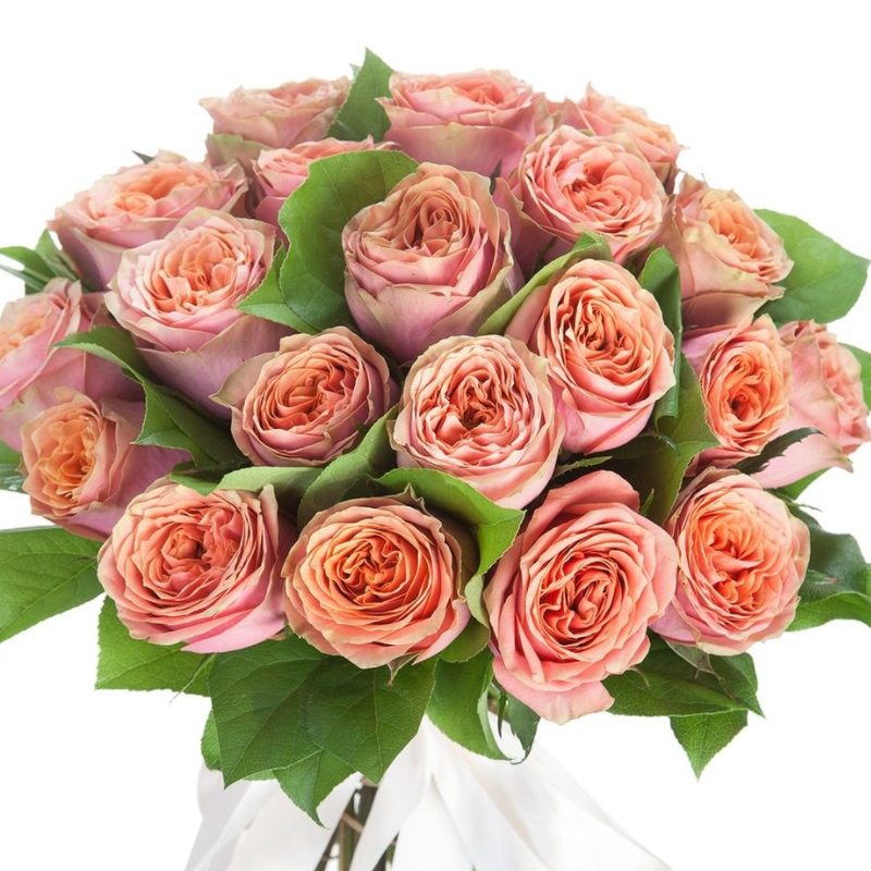 Букет состоит из 21 пионовидная роза, салал, прозрачная упаковка, атласная лента.